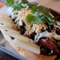 The whole place is very nicely decorated , we were greeted by a nice hostess and she explained the menu and suggested a few things, we ordered a bacon wrapped hotdog with a Chile poblano with crema bits of pomegranate sprinkled and another crunchy topping I'm thinking it's onions , it was soooooo Good I highly recommend this one , French fríes , and the xolo dog ! Everything is delicious ! I left pictures so you all can see the deliciousness